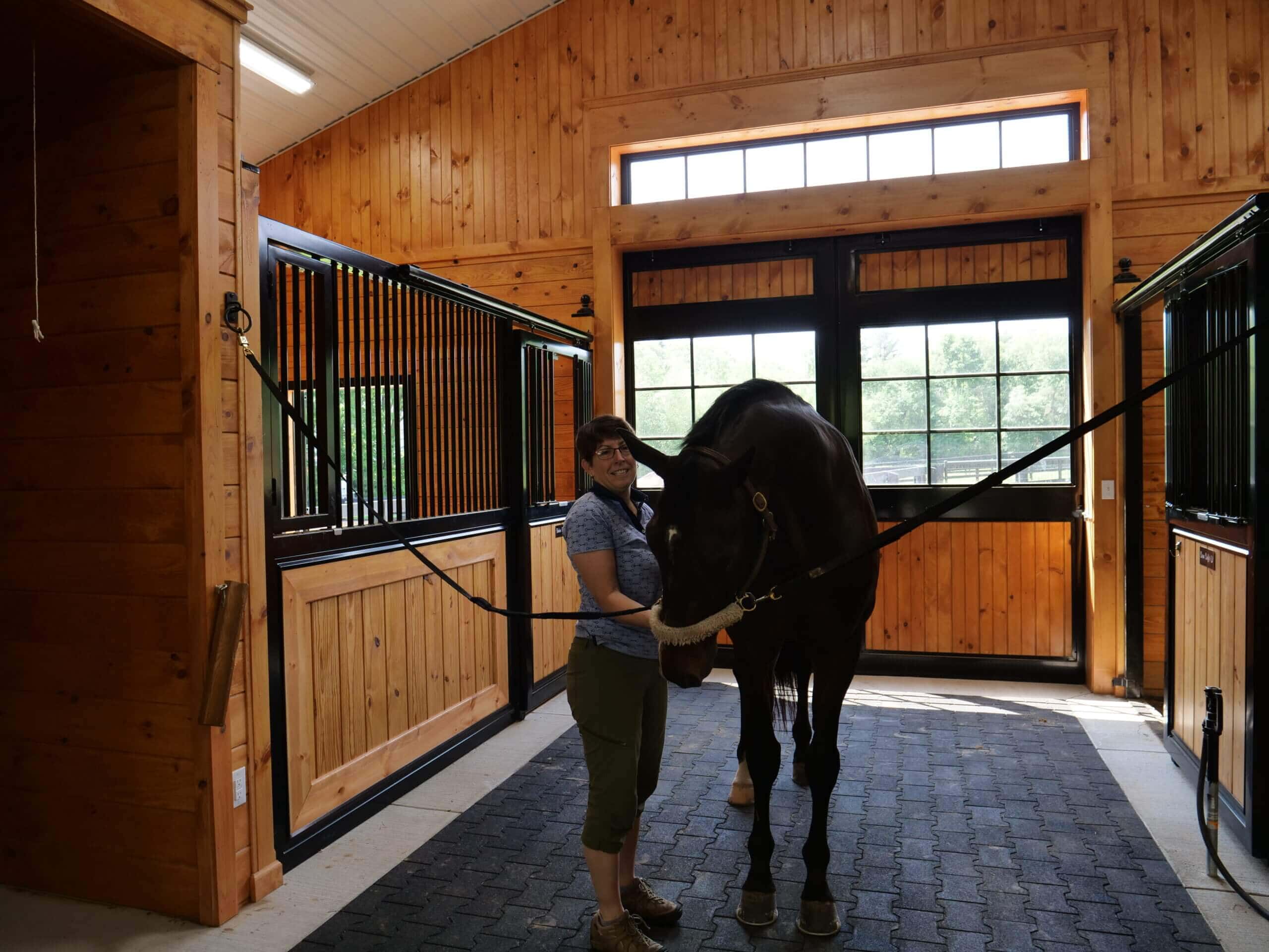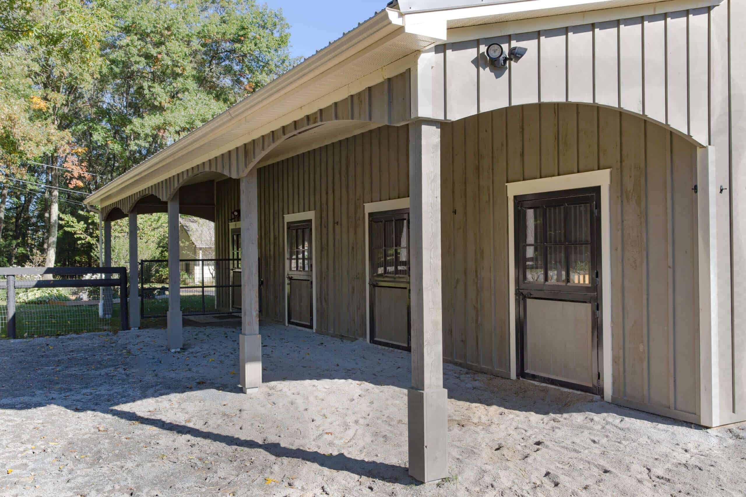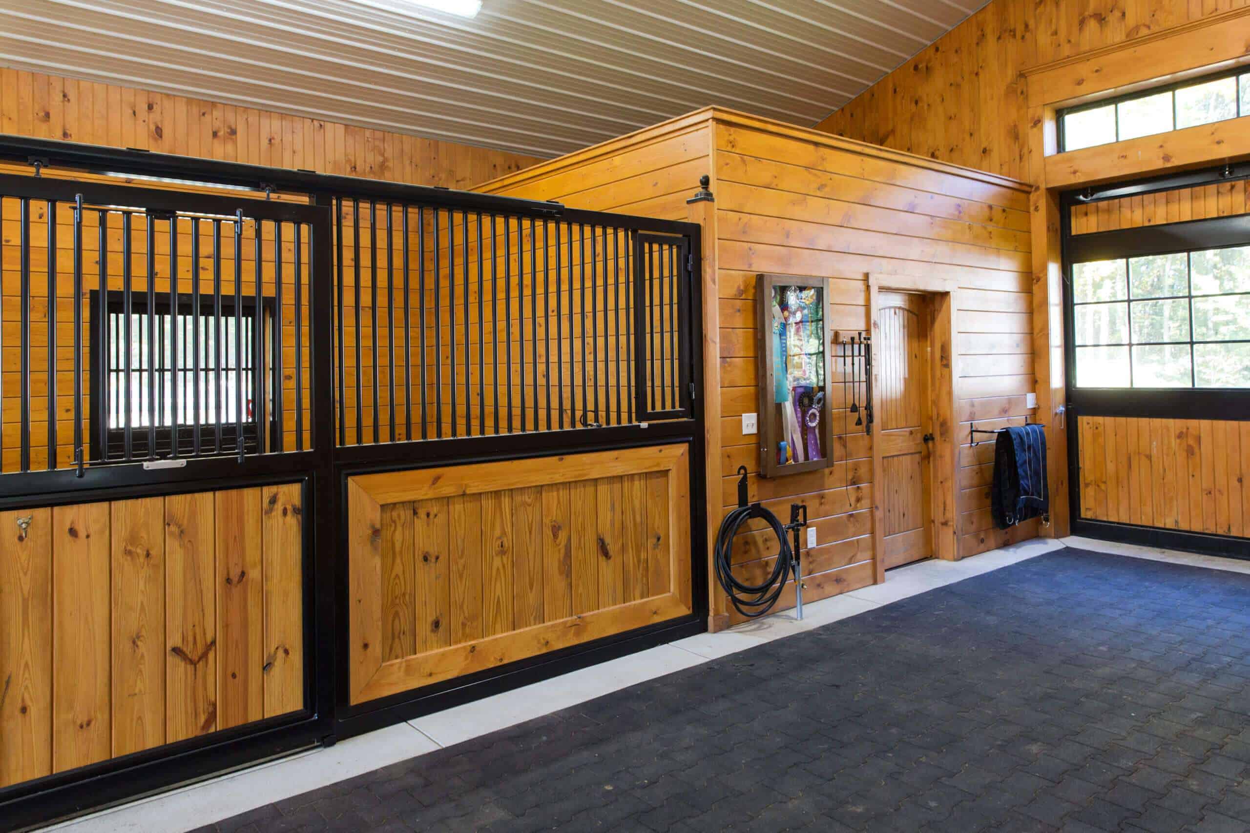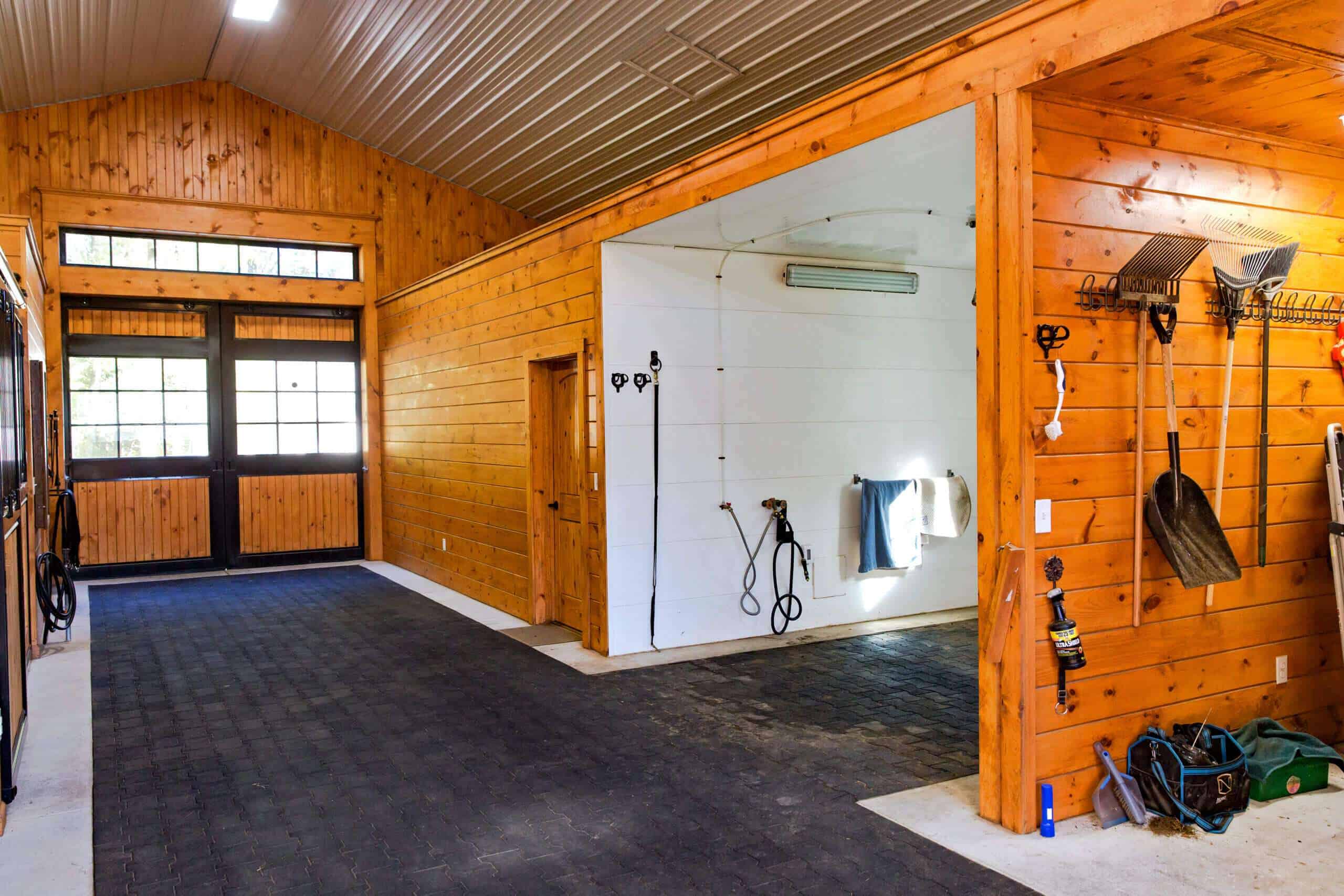 Our customer cares for her animals and was happy to choose us as her builder for the custom designed horse barn. Light is the hallmark of this barn. From the stunning aisle doors to the bright wash stall, this barn is a dream to work in, right down to the custom feed room cabinets! A beautiful barn for beautiful horses!