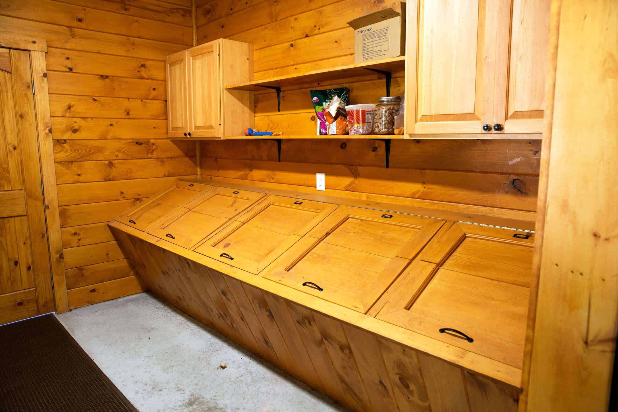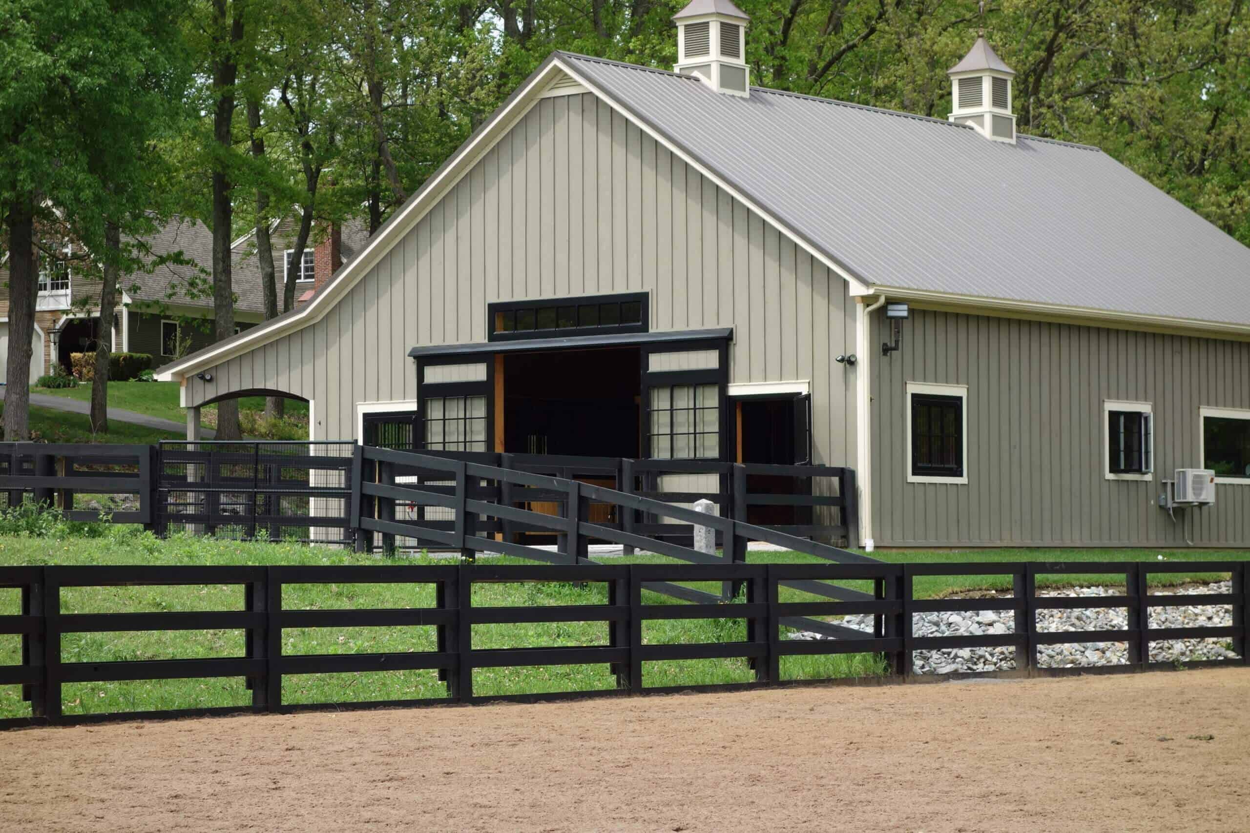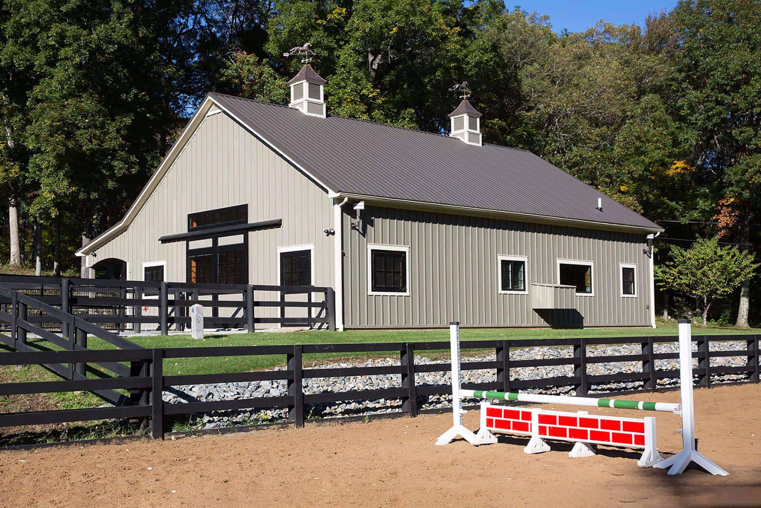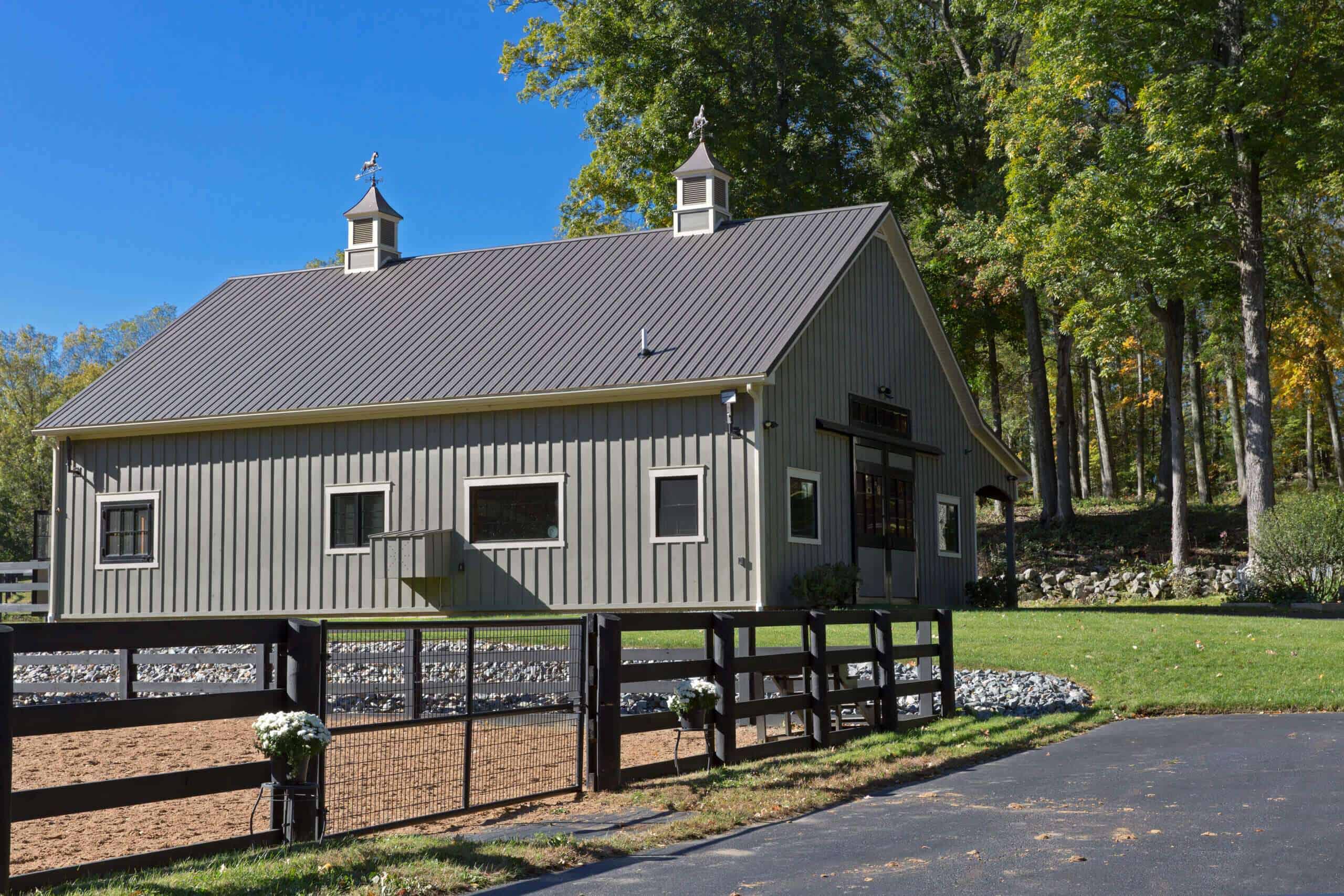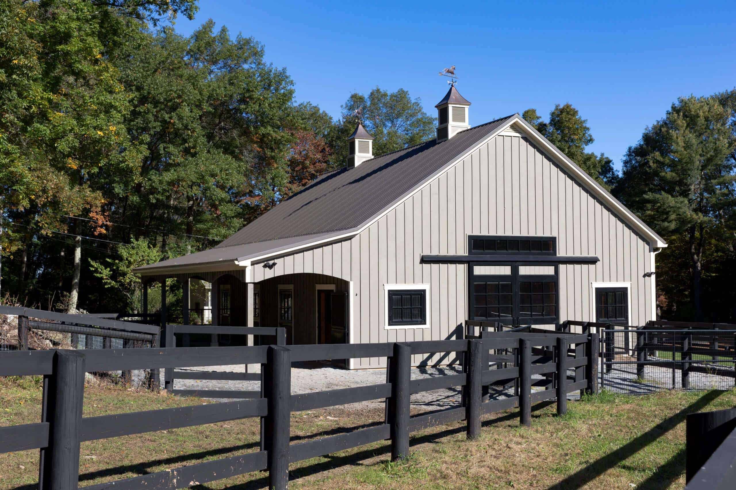 Our customer cares for her animals and was happy to choose us as her builder for the custom designed horse barn. Light is the hallmark of this barn. From the stunning aisle doors to the bright wash stall, this barn is a dream to work in, right down to the custom feed room cabinets! A beautiful barn for beautiful horses!