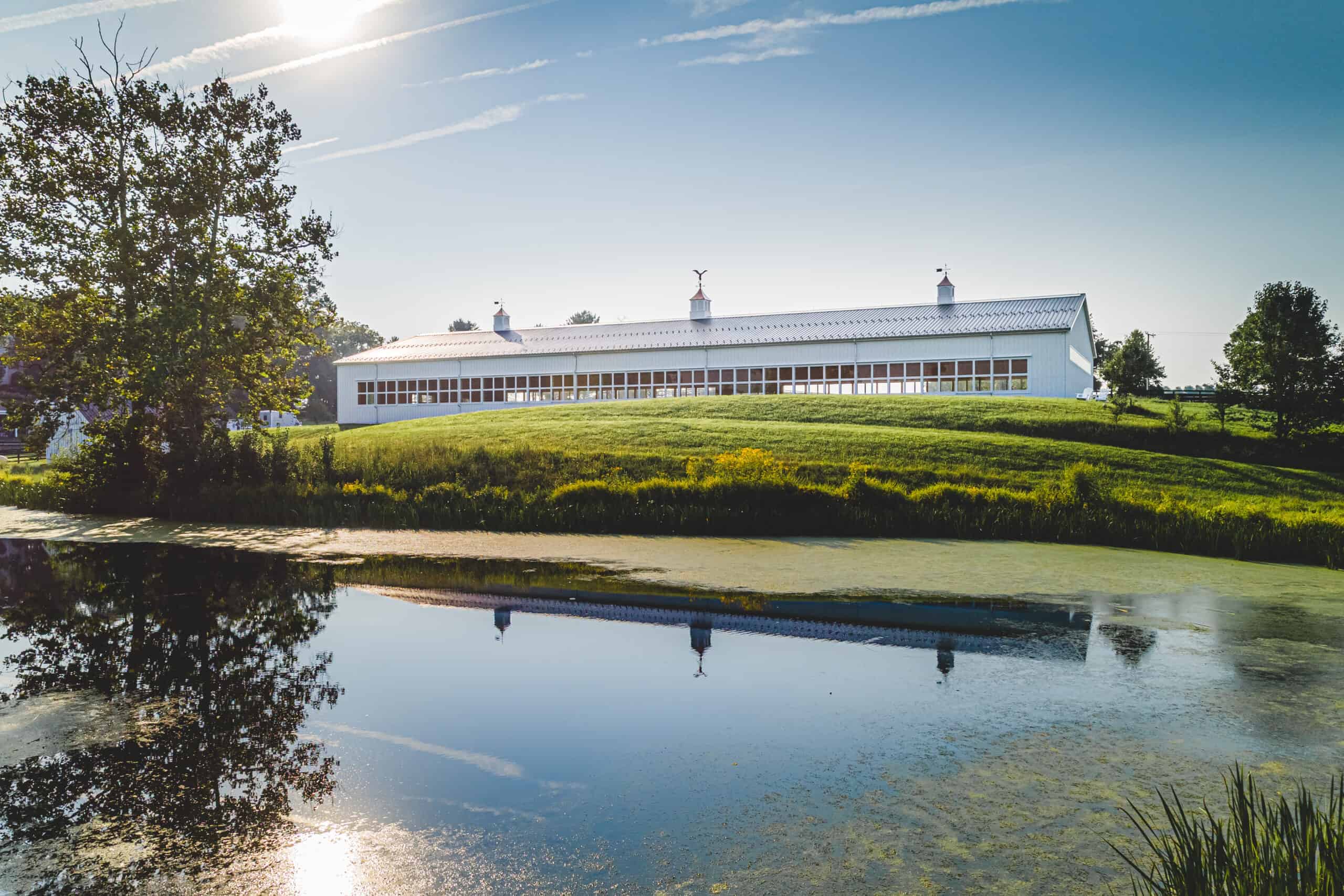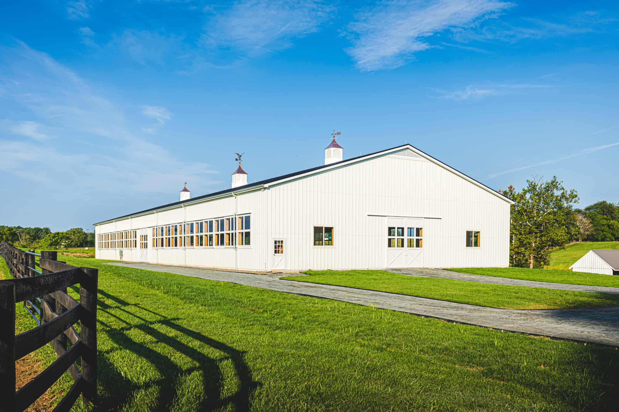 The owner of this magnificent indoor arena chose an all white color scheme to complement her historic house. When you effortlessly open the custom aluminum doors, the first thing noticed is an overall sense of peace. At 80 x 216‘ x 18‘ tall complete with scissor trusses that allow the center third to be 3 feet taller than the sidewalls, it not only accommodates a full-size dressage pattern, but also an 8 foot deep area for the horse to enter and be acclimated and a raised viewing area.