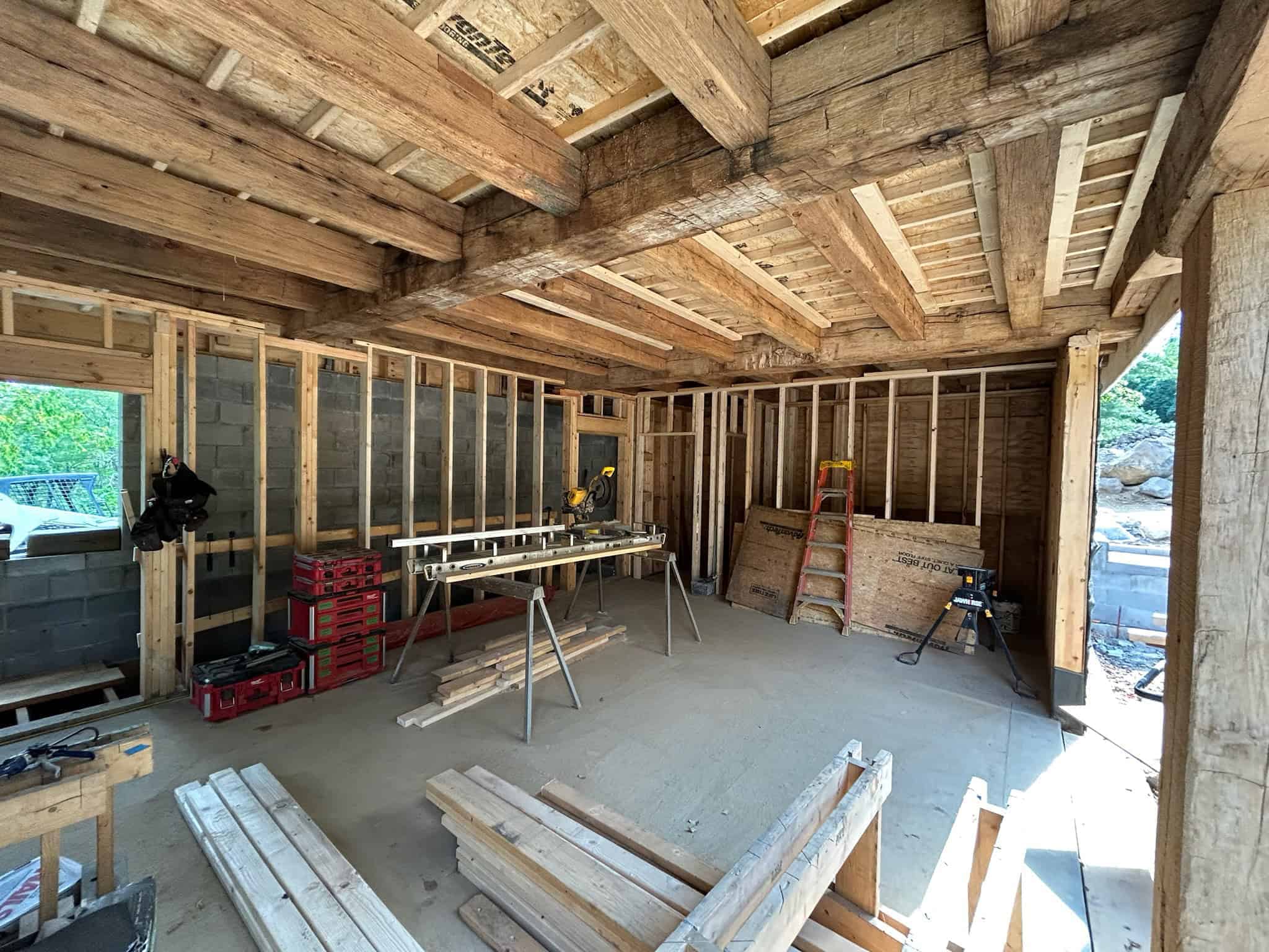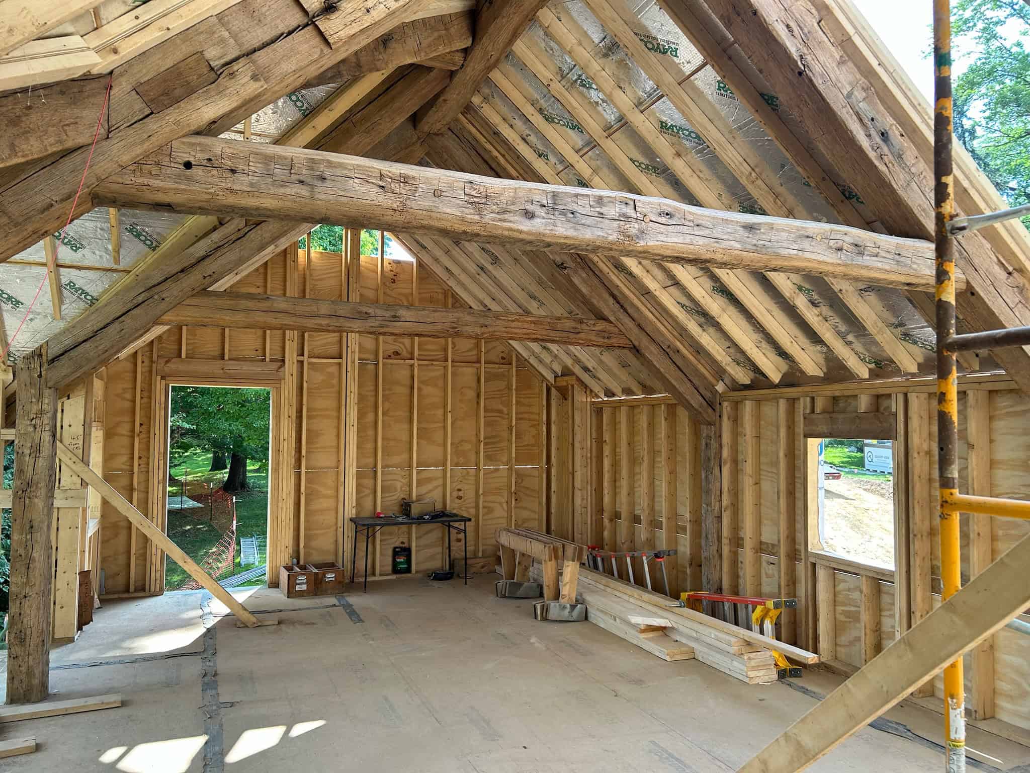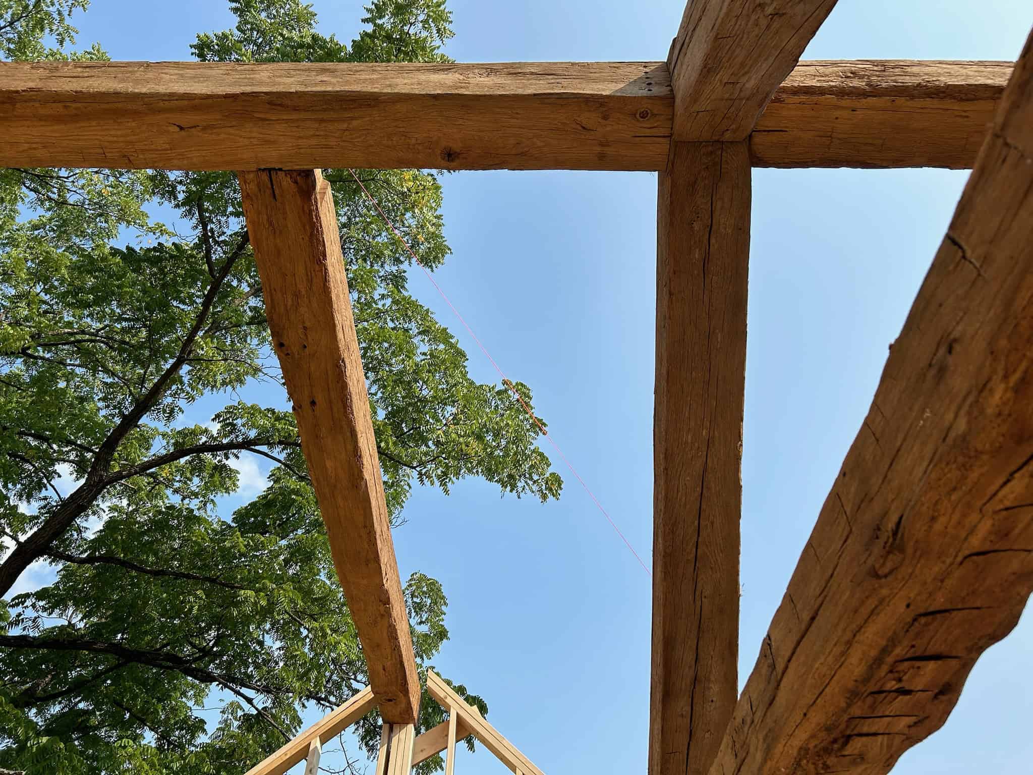 Being well-versed in heavy timber joinery is crucial for the successful outcome of a heavy timber frame. This pool house in Newtown Square exemplifies where our craftsmen truly shine. The reclaimed hand-hewn oak frame required extensive hand cutting on-site to accommodate inconsistent member sizes, live edges, and material that isn’t straight.