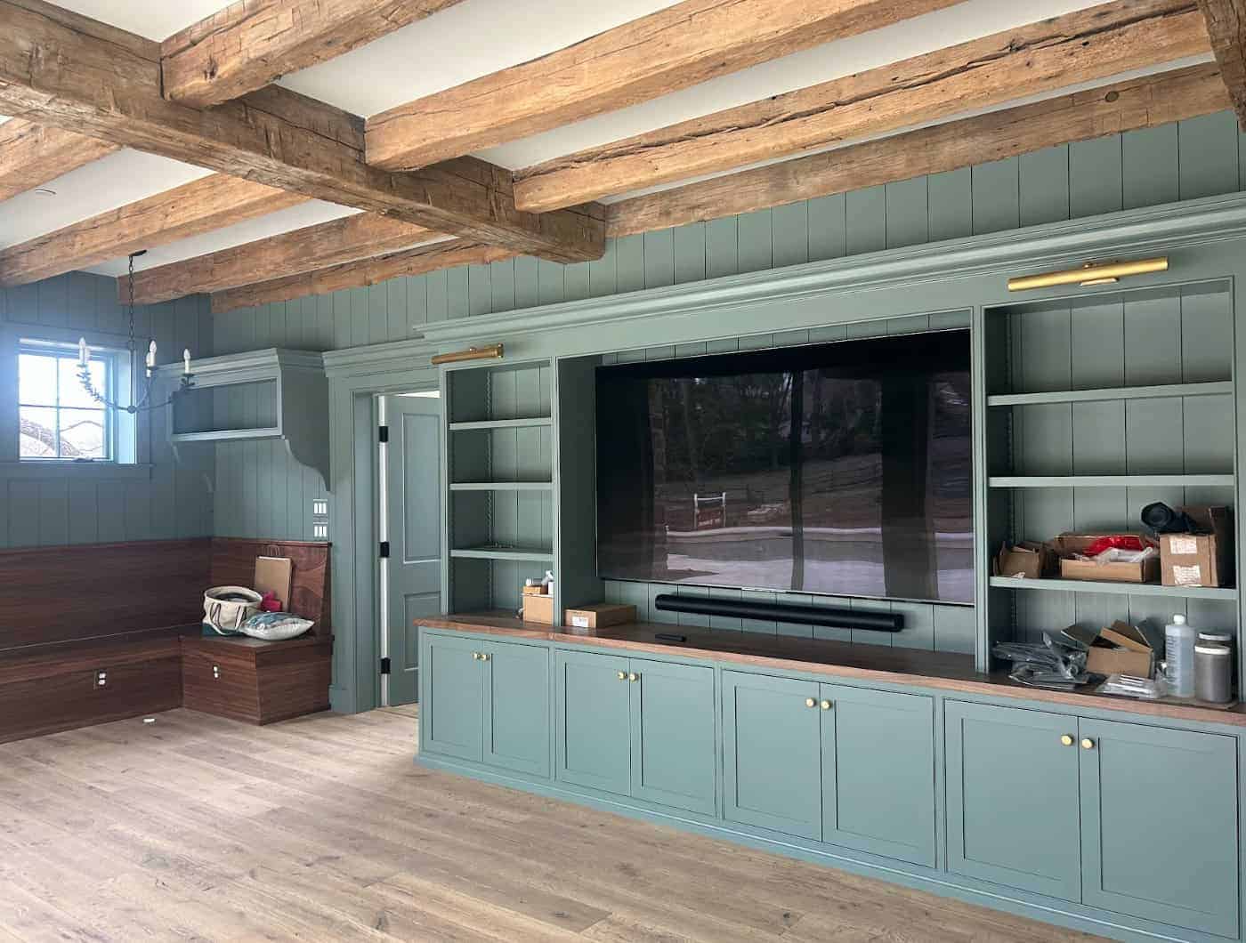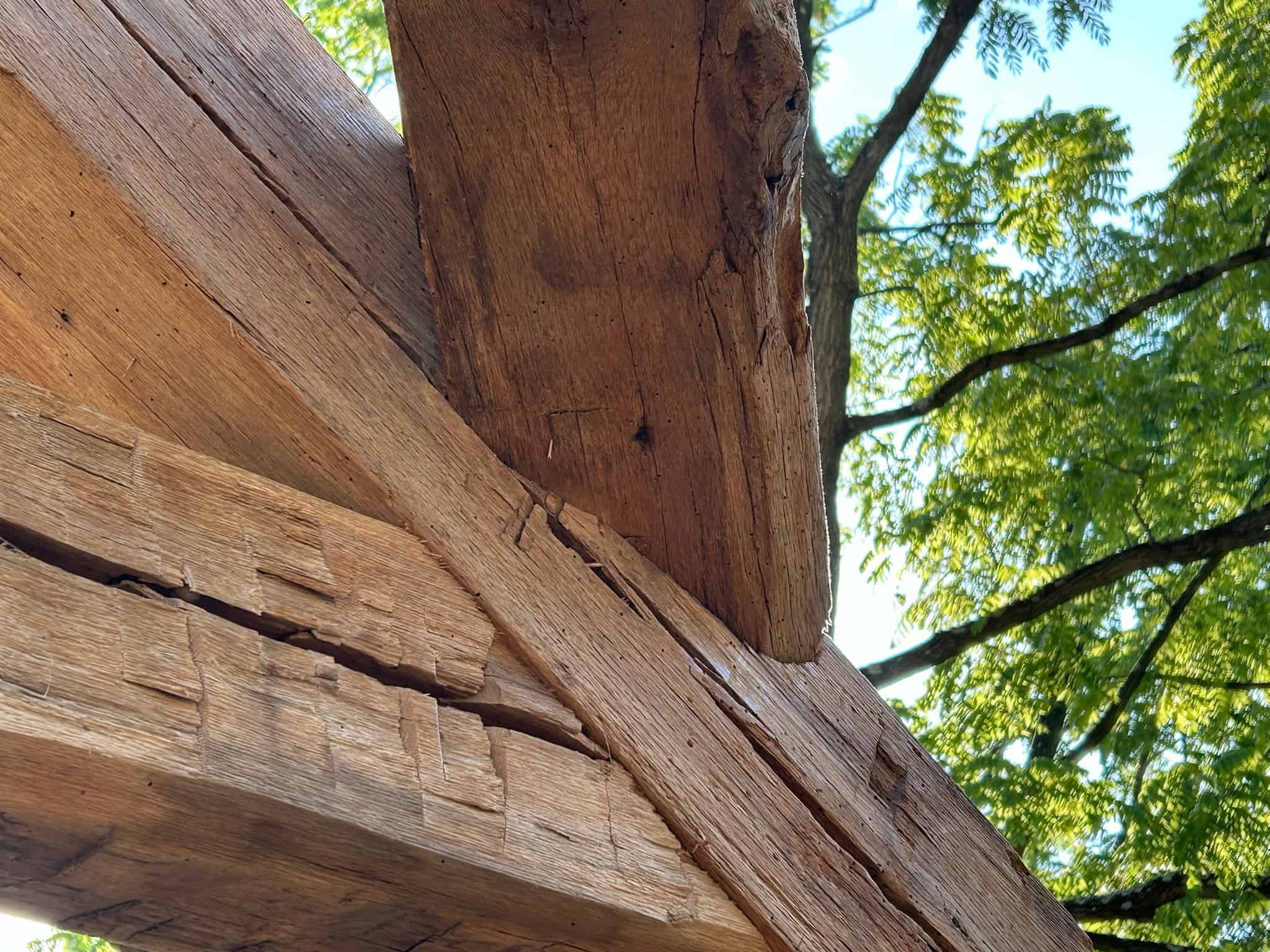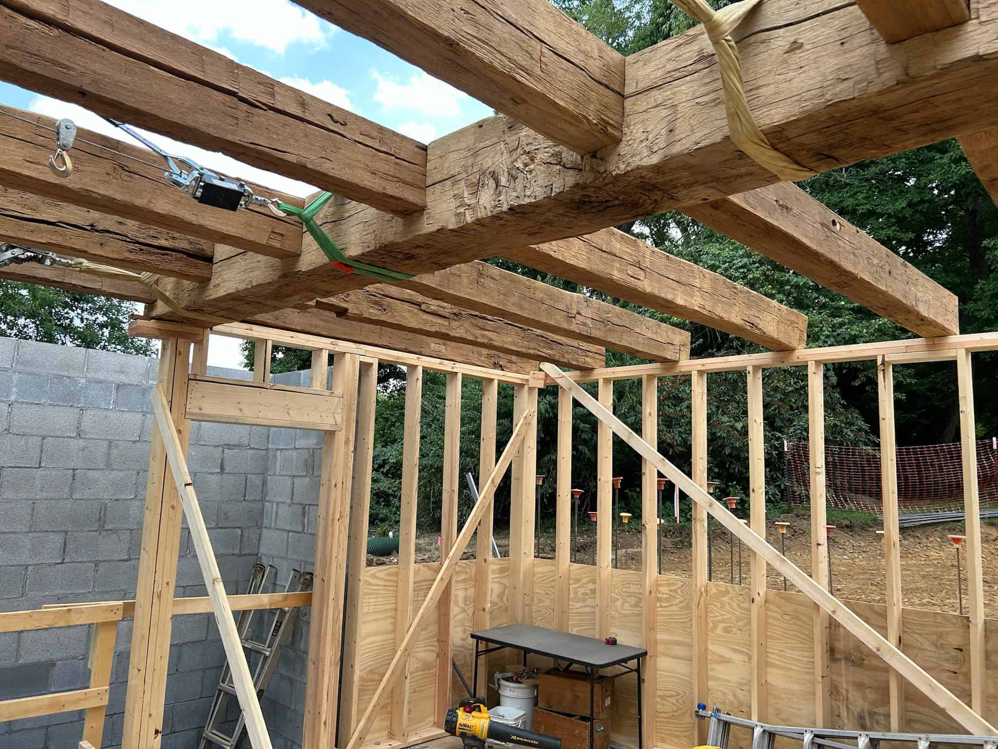 Being well-versed in heavy timber joinery is crucial for the successful outcome of a heavy timber frame. This pool house in Newtown Square exemplifies where our craftsmen truly shine. The reclaimed hand-hewn oak frame required extensive hand cutting on-site to accommodate inconsistent member sizes, live edges, and material that isn’t straight.