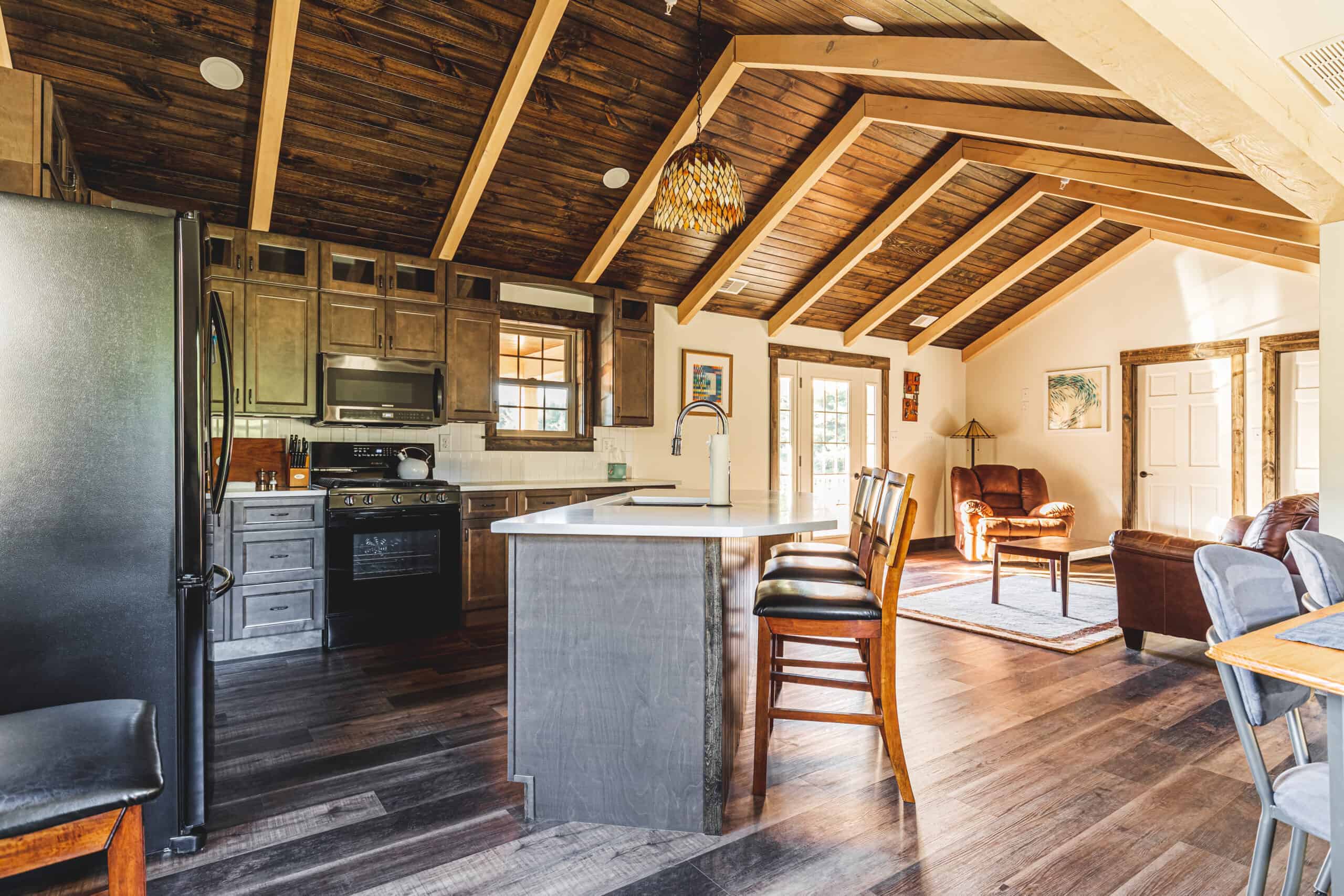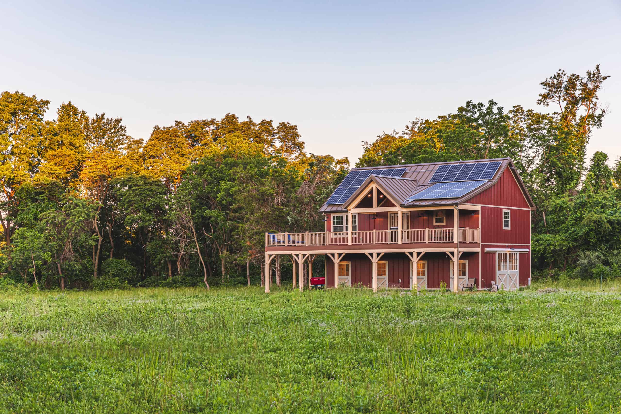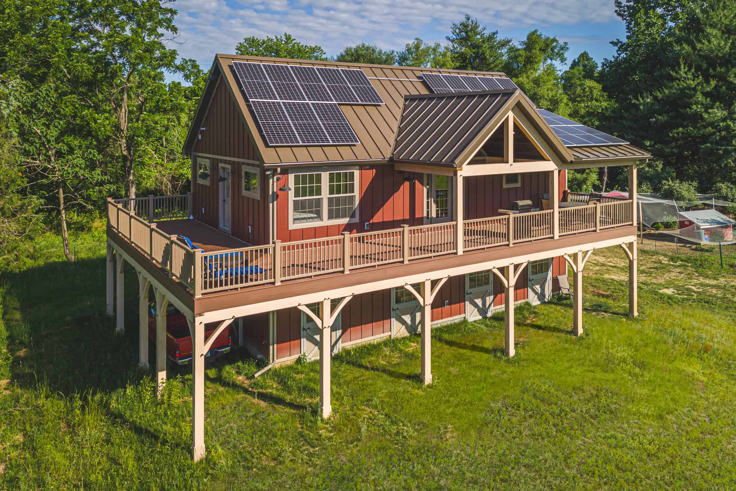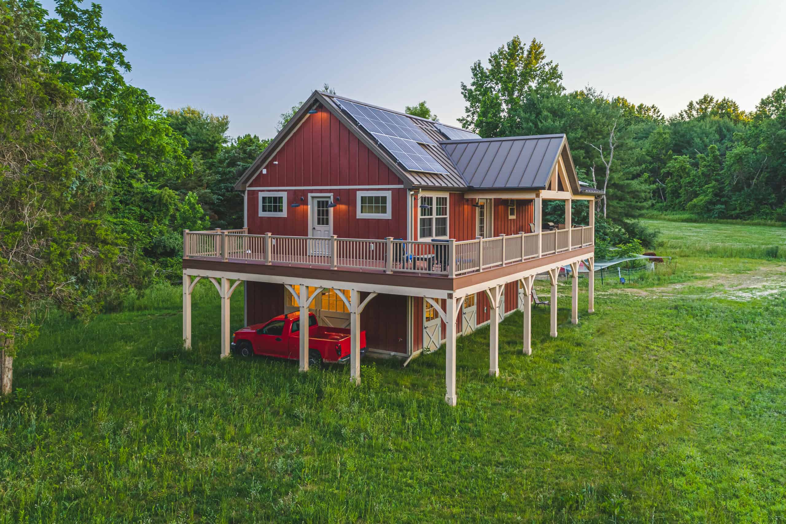 This beautiful barn home is adorned with timber frame accents, solar panels, and a massive wrap around deck. Sporting the classic red barn look & cathedral ceilings, this barn home serves as a relaxing oasis for our client to practice his farming hobby. A barn home that combines agricultural space with living space in one building requires a specialized set of skills from a professional builder.